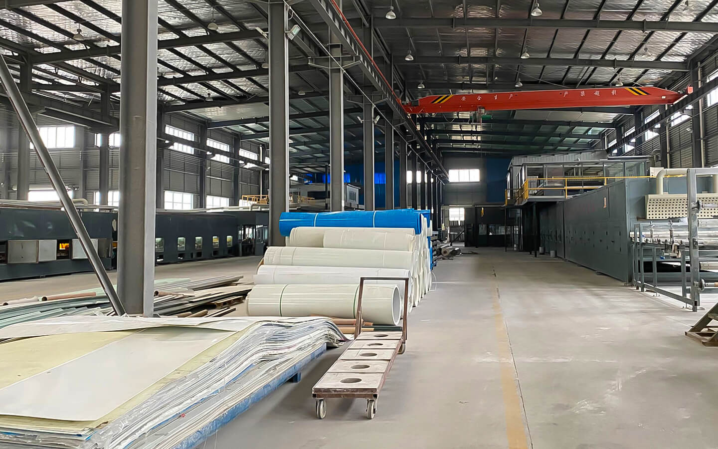 泰州中盛機(jī)電有限公司在引進(jìn)消化美國FRP自動化板材生產(chǎn)線的基礎(chǔ)上,生產(chǎn)具有高鋼性、高韌性、強耐腐性、耐候性的FRP板材。